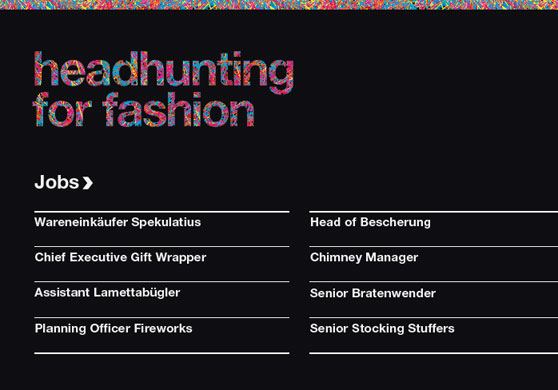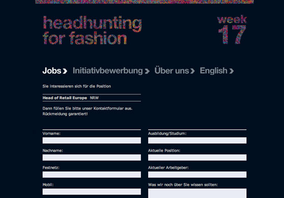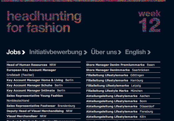 Headhunter sagt heute jeder. So wird die Wortmarke zum Signal für die ganze Branche. Der Schriftzug headhunting for fashion zeigt mit seiner filigranen Struktur die Vernetzung und Kontakt-
