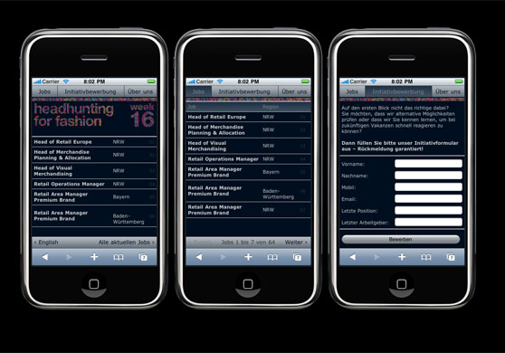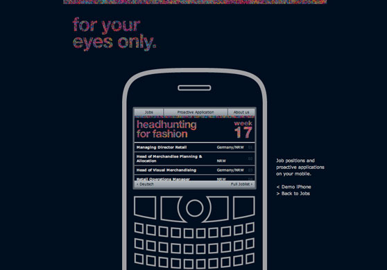 Smartphones und Jobwechsel gibt es überall. Was liegt da näher, als die komplette Jobbörse mobil zu schalten? Die gesamte Website ist an die Gadgets der Zielgruppe angepasst, egal ob Blackberry, iPhone oder Android. Eine PR-Aktion platziert den Begriff mobile headhunting im Netz.